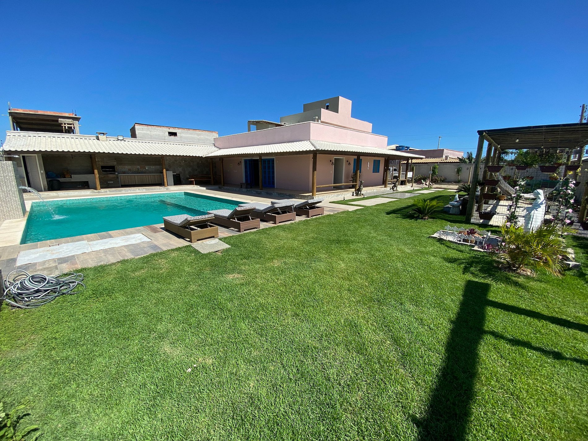 O terreno possui 1.000 m2, contem uma casa 4 quartos e 2 lofts, um no pavimento térreo e outro no pavimento superior, que são disponibilizados conforme a demanda de numero de hospedes. Também possui piscina, churrasqueira, 3 banheiros externos, redario, gazebo.