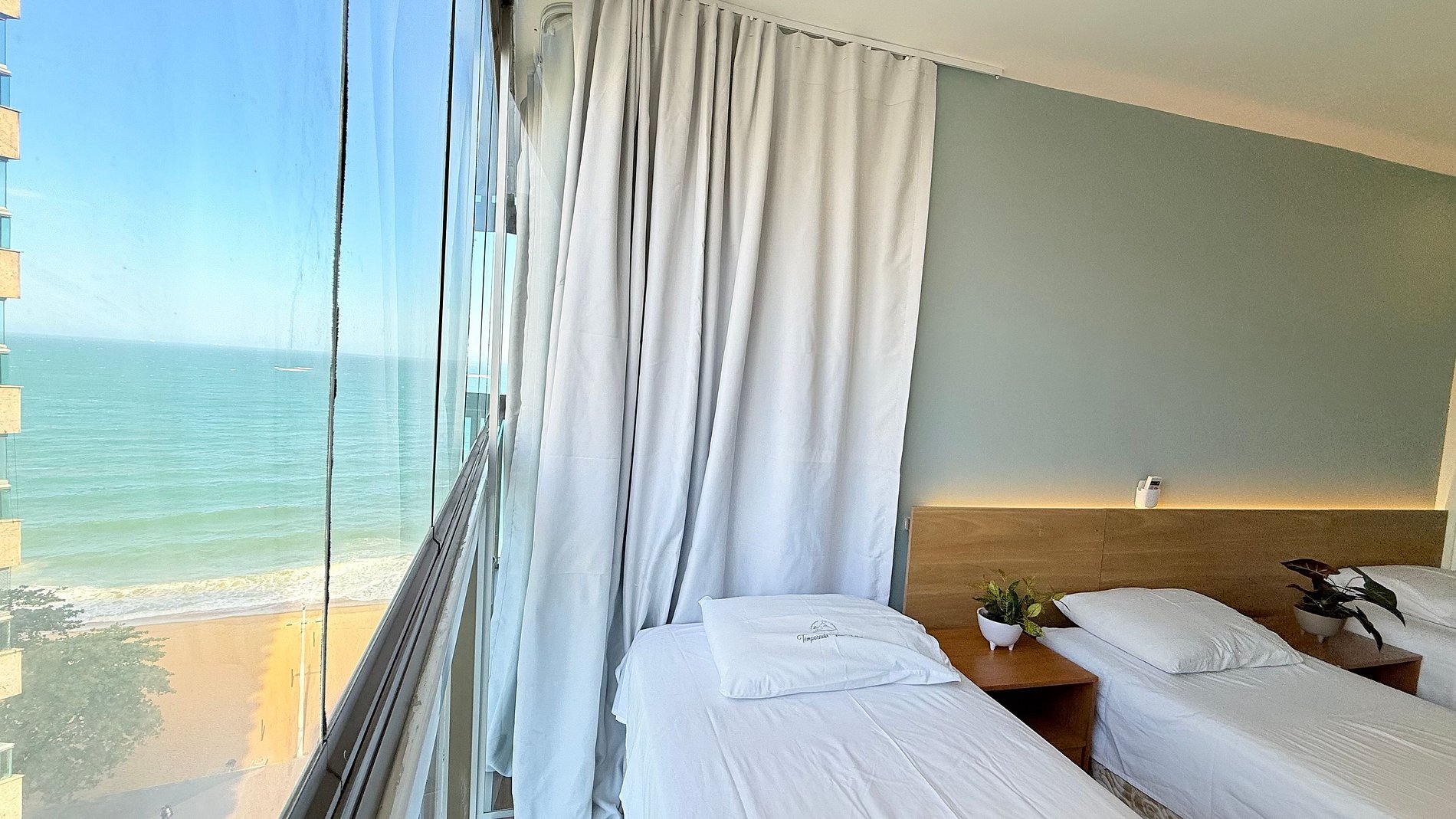Apartamento lateral, com vista do mar, 2 quartos, 2 banheiros (sendo um suíte), ocupação máxima de 6 pessoas. O imóvel é equipado para preparo de refeições rápidas, com fogão de indução, roupas de cama e banho de acordo com o numero de hospedes (informar se é casal ou não para a arrumação correta das camas).