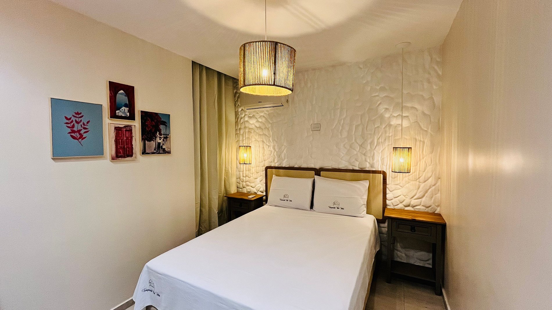 Apartamento frente mar, 2 quartos, 1 banheiro, ocupação máxima de 6 pessoas, equipado para preparo de refeições.